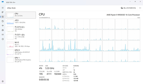 | CPU | AMD「Ryzen 9 9950X3D」 (16コア/32スレッド、最大5.7GHz、TDP170W) |