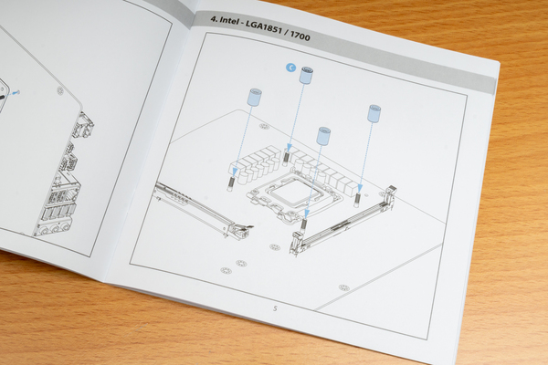 手始めに「Steel Legend 360 LCD」の付属品などを確認する。パッケージは、白色基調のSteel Legendらしいデザインで、パッケージを開くと、ラジエーターなどがブロック状の梱包材に仕切られて収まっていた。パーツ部位ごとに名称が記述されているので、初めてAIO水冷クーラーを使う人にもわかりやすいだろう。