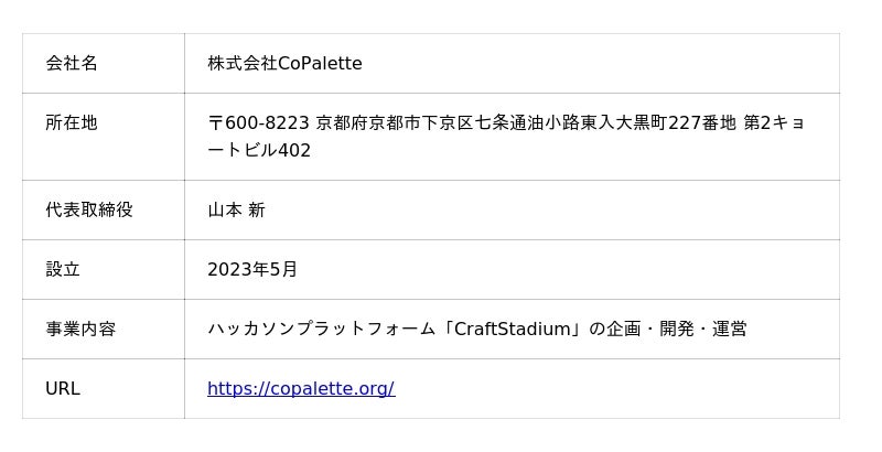 株式会社CoPalette「創るたびに、強くなる。」をミッションに、ハッカソンの検索・参加・主催をワンストップで提供するプラットフォーム「CraftStadium」を運営。京都市・同志社大学・京都産業大学等と連携し、過去様々なハッカソンを支援。East Venturesから出資を受けた京都発スタートアップ。