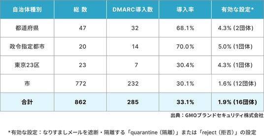 GMOインターネットグループのGMOブランドセキュリティ株式会社(代表取締役社長:中川 光昭、以下「GMOブランドセキュリティ」)は、全国の自治体(47都道府県および815市区(政令指定都市20+772市+東京23区)が保有する、ドメイン末尾が「.lg.jp」である計862団体を対象に、送信ドメイン認証技術『DMARC(※1)(Domain-based Message Authentication, Reporting, and Conformance)』の導入状況に関する調査を実施いたしました。