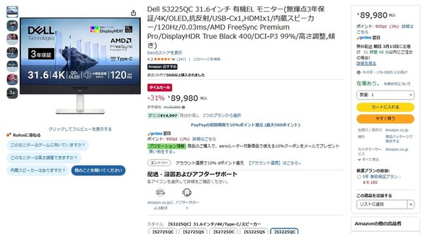 Amazon.co.jpにて、Dellの31.6型・4K有機ELディスプレー「Dell S3225QC」が販売中だ。参考価格は12万9800円だが、タイムセールにより31%オフの8万9980円で購入できる(3月12日時点)。