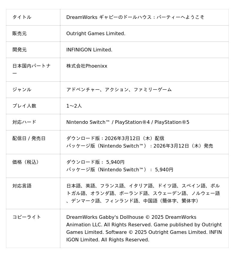 株式会社Phoenixx(フィーニックス)(東京都武蔵野市、代表取締役社長:坂本 和則)は、テレ東系列の放送(毎週土曜あさ9時30分から放送中)やNetflix、YouTube、そして映画などで大人気のアニメ『ギャビーのドールハウス』のゲーム、『DreamWorks ギャビーのドールハウス:パーティーへようこそ』を本日2026年3月12日(木)よりNintendo Switch(TM) / PlayStation(R)️4 / PlayStation(R)️5向けに、販売を開始することをお知らせいたします。