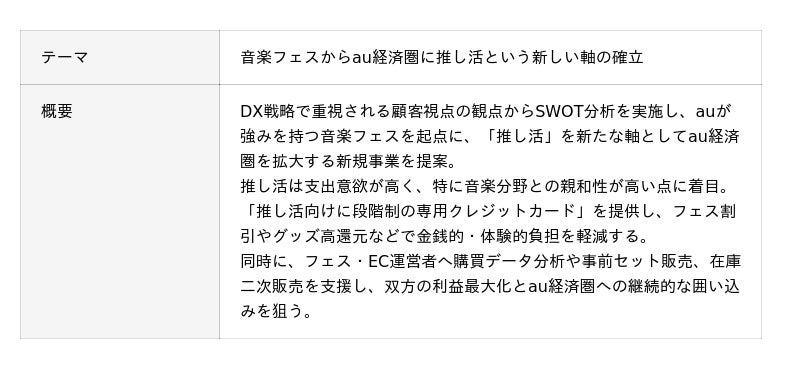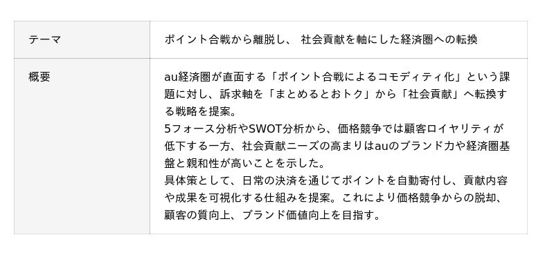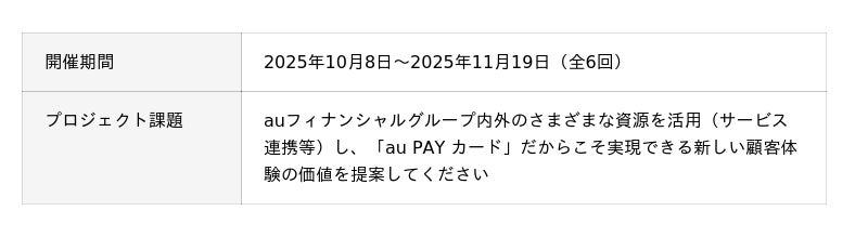 本プログラムでは、当社が設定した「auフィナンシャルグループ内外のさまざまな資源を活用(サービス連携等)し、『au PAY カード』だからこそ実現できる新しい顧客体験の価値を提案してください」という課題に対し、参加学生がチーム単位でDX戦略に関する専門知識を活かして解決策の提案に取り組みました。学生は全6回のプログラムを通じて、これまで学んだリーダーシップ理論、経営戦略理論を活用しながら、仮説の構築やデータ収集および分析、提案資料の作成を行いました。最終回では、これらの検討結果に基づき、顧客体験価値の向上に資する施策についてプレゼンテーションを実施しました。
