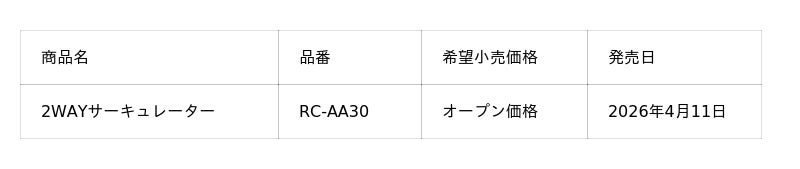 象印マホービン株式会社は、本体に内蔵された象印独自の「スマートルーバー」により2種類の風を自動で切りかえる、2WAYサーキュレーター(RC-AA30)を2026年4月11日より発売いたします。