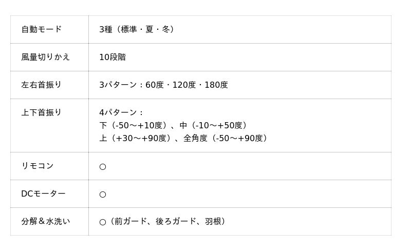 - 冬モード :暖房機器と組み合わせて使用する時に便利なモードです。上向きの首振りをメインとす