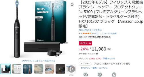 フィリップスの電動歯ブラシ「ソニッケアー プロテクトクリーン 5300」がAmazonタイムセール対象。参考価格15,840円のところ、24%オフの11,980円で販売中。