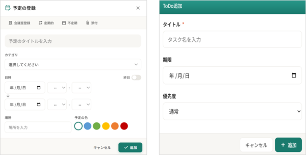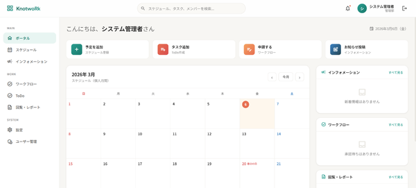 「KnotwoRk」が搭載する主な機能は、個人単位や組織単位で確認できるスケジュール管理、業務タスクの管理(ToDo機能)、社内申請を効率化するワークフロー機能、連絡事項の共有と管理ができる回覧機能。これらによって社内の業務可視化と情報共有を促進し、組織全体の業務効率向上を支援するという。