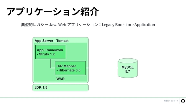 第2回(Lv2)のクエストは、「書店管理システム」のモダナイゼーションだ。このシステムは、Java 5で構築された典型的なレガシーWebアプリケーション。さらに今回、SQLインジェクションの脆弱性やGod Class(責務過多なクラス)など、問題のあるコードパターンが“意図的に”混入され、わざわざコードの品質も下げられている。