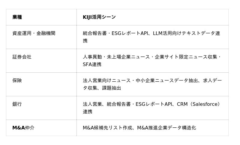 AIの実用化が急速に進む中、金融機関・証券会社・保険会社をはじめとする法人営業部門では、企業情報の収集・整理・分析に多大な工数が発生しています。KIJIは、公開情報の自動収集からAI活用に対応した構造化テキスト変換まで、一貫したデータパイプラインを提供することで、企業調査・営業活動・投資判断の効率化を実現します。