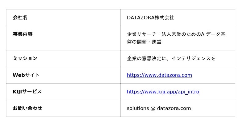 DATAZORA、「KIJI」AI活用に向けた法人データ基盤として企業基本情報・開示情報・求人データのAPIを正式提供開始