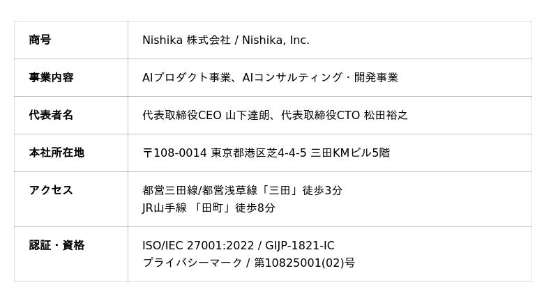 Nishikaは「テクノロジーですべての人が誇りを持てる社会を」をビジョンに掲げ、企業の生産性を高める新たなデータ資産創出に取り組んでいます。 中でも、SecureMemo/SecureMemoCloudを通じて「企業の会議を全てデータ化する」ことをプロダクトビジョンとしており、日本のビジネス会議における会話情報を精度高く記録・構造化することで、付加価値の高い情報活用を実現することを目指しています。