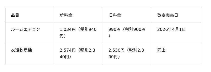 リンナイ株式会社(本社:愛知県名古屋市、社長:内藤 弘康)は、当社製の家庭用ルームエアコンと家庭用衣類乾燥機につきまして、2026年4月1日より再商品化等料金(家電リサイクル料金)を改定いたしますので、特定家庭用機器再商品化法第20条第1項の規定に基づき公表いたします。