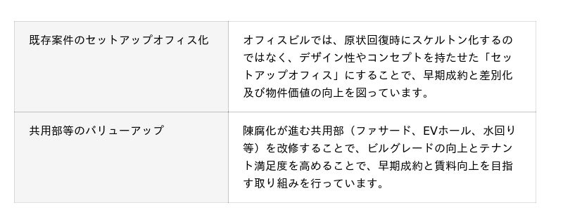 東京キャピタルマネジメントでは、維持管理に留まらず「価値創造」をテーマとし、不動産資産に+αの付加価値をつける取り組みを推進中です。既存物件のセットアップオフィス化や、ファサード・EVホール・水回りなど共用部の改修を行い、利用者の利便性やビルグレードを高めるなど、物件の競争力向上と賃料水準改善による収益向上に繋げています。また物件の用途や立地、周辺の賃貸市場を踏まえた運営方針を立て、リーシング計画や改修内容に反映させています。今後もさらに不動産資産価値の向上と差別化を図る取り組みに邁進してまいります。