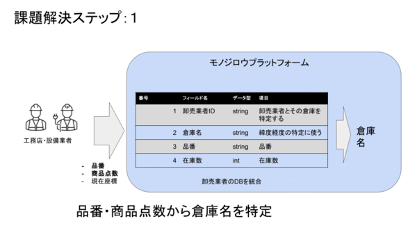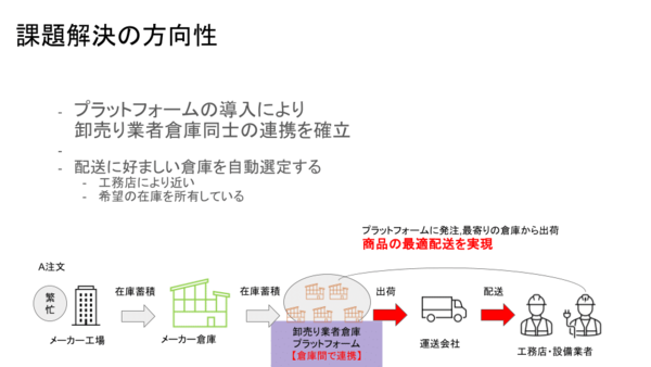 給湯器、エアコン、配管などの住宅設備は、製造元のメーカーから卸売業者を介して、購入元の工務店や住宅設備の施工事業者へ配送される。工務店や施工事業者は必要なものをすぐに入手したいので、近くの倉庫から配送してほしいが、どの卸売業者の倉庫が近いか、倉庫に在庫があるかどうか、という情報は知るすべがない。