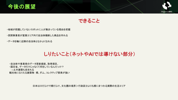 観光地のPRや活性化、土産物の企画といった施策は、自治体ごとに実施されるケースが多い。自治体の枠を超えた広域観光エリアを新たに定義できれば、人気のないエリアを近隣観光エリアへ包括して魅力を押し上げたり、民間事業者が自治体横断の新たな土産物や観光サービスを提供したりといったことにつながる。