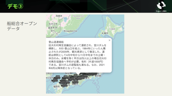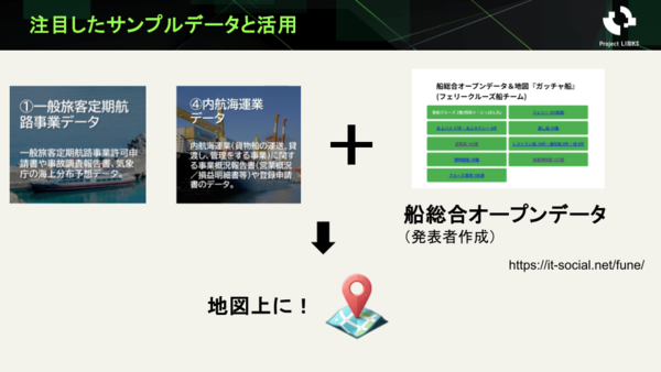チーム・フェリーナビのメンバーは、LINKSの一般旅客定期航路事業データ、および内航海運業データを活用し、いつ・どこで・どのような船が就航しているかを可視化するアプリケーション「フェリーナビ」のアイデアを発表した。