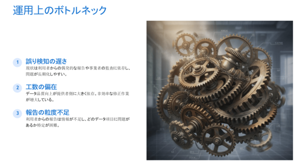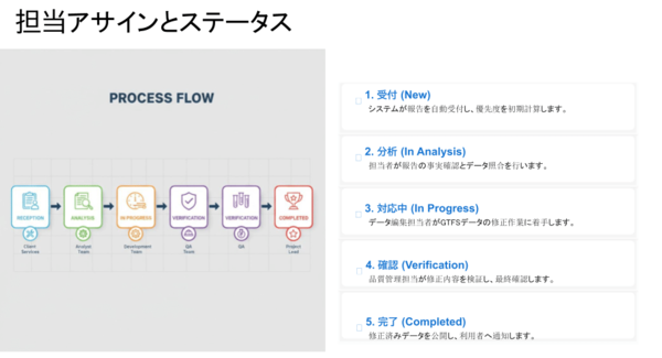 同チームは、オープンソースソフトウェアのバグ修正のプルリク「プルリクエスト:Pull Request)と同じように、バス路線情報の誤りを利用者が報告する仕組みを考案。重要度に応じたSLAを設定し、さらに誤り報告の自動エスカレーションや、誤り報告をGTFSのフォーマットにマッピングして自動で差分抽出する機能を設けることで、修正リードタイムの短縮やヒューマンエラー解消につなげる。