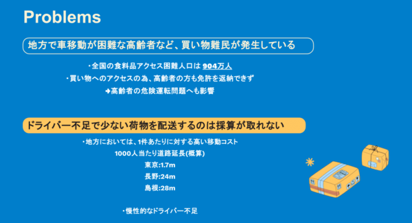 公共交通機関が乏しい地方都市では自家用車への依存度が高い一方で、自ら運転することが難しい高齢者などが”買い物難民”になる問題が深刻化している。食品や日用品の購入に配送サービスを利用するにしても、そもそもドライバー不足が社会的な課題となっているうえに、人口が少ない地域では配送1件にかかるコストが高くなり、配送事業者が不採算に陥りがちだ。