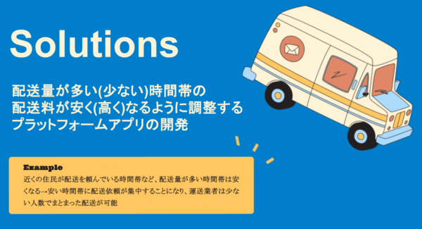 チーム・大崎アジャーズは、地方での配送の課題を解決するプラットフォーム「No-Waste Delivery」のアイデアを発表した。