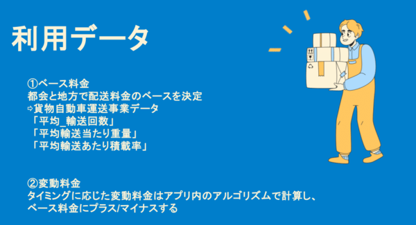 同チームが発想した「No-Waste Delivery」は、配送量が多い時間帯の配送料を安く、配送量が少ない時間帯の配送料を高く調整するプラットフォームアプリだ。LINKSの貨物自動車運送事業データに含まれる輸送回数、輸送あたり重量、積載量などのデータを活用している。