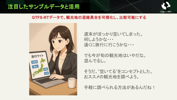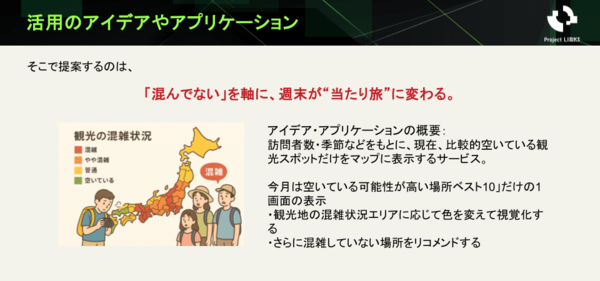 “週末の予定がぽっかり空いてしまった”――そんなときに手軽に旅行に行けるような、“混雑していない”を基準に、おすすめの観光地を調べることができるというもの。GTFS-RTデータで観光地の混雑具合を可視化。訪問者数や季節などの情報をもとに、比較的混雑していない観光地のみをマップアプリに表示する。また、過去のデータを活用して、“今月は空いている可能性が高い場所ベスト10”といった情報を視覚的に示すなどして、リコメンド表示することも検討したいと考えているという。
