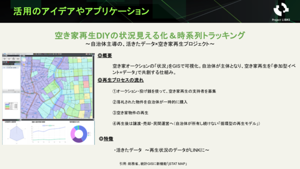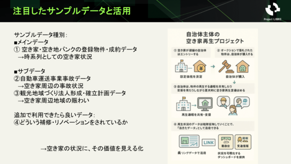 空き家問題の解消に向けては、国や自治体が空き家情報を公開し、購入希望者をマッチングする仕組みを提供している。同チームが考案したアイデアは、マッチングにとどまらず、空き家の再生過程を情報としてLINKSのオープンデータに追加して公開し、まちづくりの一環として支援者を巻き込みながら問題解決に取り組もうというもの。