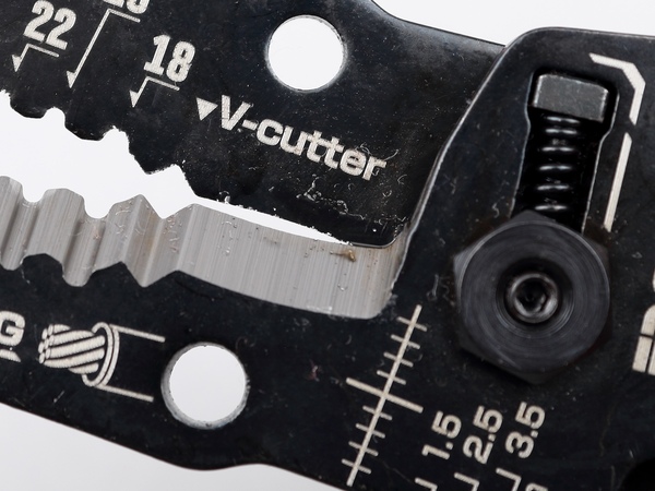 芯線を傷つけないギミックにばかり目が行きがちですが、普通のワイヤーストリッパーとしても便利な機能があります。例えばカッター部分。よく見るとただの直線ではなく、中央部が軽く湾曲し、ケーブルが滑って逃げないよう工夫されていました。