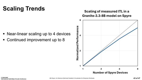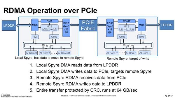 最後に拡張性。先程も少し触れたが、Spyre同士はPCIeに対してRDMAを実施できる。これを利用することで最大64GB/秒の帯域で接続できるので、間にPCIeファブリックを挟めば複数枚の相互接続ができる。といってもRDMAなので、Broadcastには対応しておらず、何枚同時に接続されていても基本的には1:1の通信になるはずだ。
