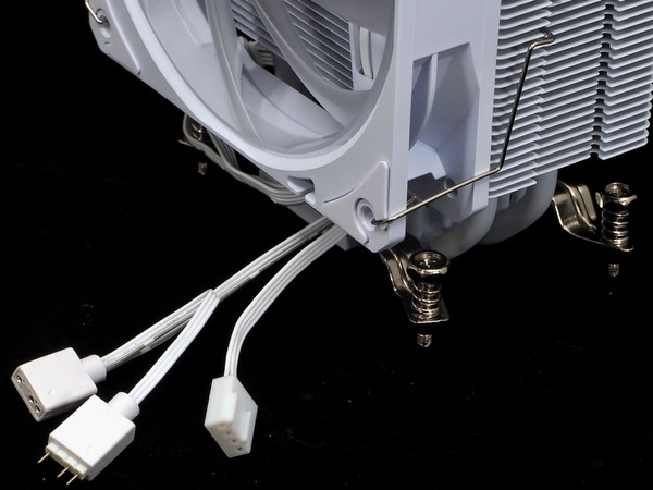 ケーブルはファンの電源になるPWM 4ピン×1、ARGB LED 3ピン×1の計2本だ。今回はホワイトモデルなのでケーブルもホワイト。なお、ARGB LED 3ピンの先端はもう1つARGB LED機器をデイジーチェーン接続可能になっている。
