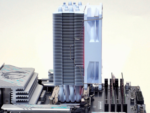 バラックだがざっと組んでみた写真もご覧いただこう。コンパクトな空冷シングルタワー型なのでVRM、メモリ、ビデオカードとの干渉はなし。メモリは4スロットすべて利用可能だ。ヒートシンク付きメモリも挿す分には問題ない。ただ、メモリの高さについては一般的な高さのものがベター、高さのあるメモリについては挿す分には問題なくても風を遮ってしまう点に要注意だ。これはサイドフロー型空冷CPUクーラー全般に言えることだ。逆にCPUソケット周りの重厚感は、空冷CPUクーラーだから表現できるものと言える。