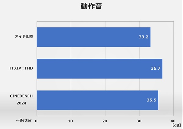 動作音値も紹介しておこう。まずアイドル時については33.2dBで、暗騒音の32dBからそれほど上昇していなかった。また、CINEBENCH 2024時は35.5dB、ファイナルファンタジーXIV: 黄金のレガシー ベンチマーク時は瞬間的だが36.7dBといった値だった。後者はゲームベンチマークなのでGPUクーラー側の音量が影響している。CPUクーラーとしての動作音イメージとしては、CINEBENCH 2024の35.5dBという値のほうが適しているだろう。ただし1600rpm時のものなので、全開2070rpm時のものではない。ただ、35.5dBと言うのはゲーミングPCとしてはきわめて静かだ。構成的にゲーミングエントリー、性能的にはフルHD、中〜高画質プレイ想定で、ライトなゲームを静かなPCでといったニーズにはピッタリだろう。