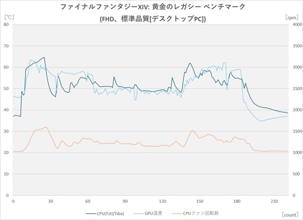 最後にファイナルファンタジーXIV: 黄金のレガシー ベンチマーク。序盤に最大温度が出ており64.6℃。終盤にも60℃を超えたシーンがあるがそれだけで、おおむね50℃台〜60℃未満で推移している。PCMark 10のGamingほどの温度上下はないが、ゲーミングではやはり温度変化が激しめになるということが分かるだろう。もちろんファンの回転数の変化も大きい。ベンチマーク開始後は1200〜1600rpmで、とくに終盤はやや高い1400rpmを挟んだ上下が見られた。