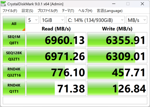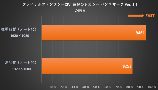 そこで「ファイナルファンタジーXIV: 黄金のレガシー ベンチマーク Ver. 1.1」を実行してみたが、「高品質(ノートPC)」設定のFHDではスコアが8253と「快適」評価。標準品質(ノートPC)だと「9461」の「快適」評価なので、このくらいの設定であればプレイできるだろう。平均フレームレートも63.7fpsなので、滑らかさを感じられるはずだ。