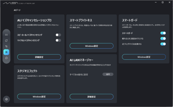 早速、ベンチマークテストを実行してみた。計測にあたり、電源モードを「最適なパフォーマンス」にし、「MSI CENTER S」の「User Scenario」を「AI Engine」にした上で、電源に接続して行なった。
