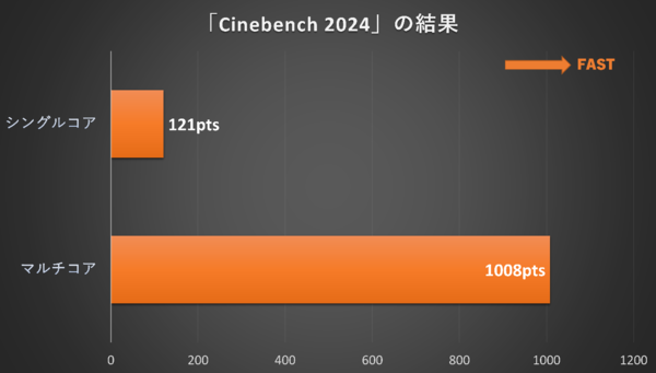 まずは純粋なCPU性能を測る「Cinebench 2024」から。結果は、シングルコアが121pts、マルチコアが1008ptsと、シングルコアの性能の高さがうかがえた。