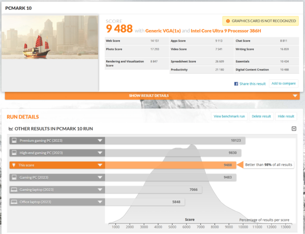 続いて、アプリ動作性能を測る「PCMark 10」を実行。結果は、スコアが9488とゲーミングPCに匹敵するレベルを叩き出している。足を引っ張っているのがVideo Scoreの7541で、ディスクリートGPUを搭載せず、プロセッサー内蔵の「Intel Graphics」である点を考慮すれば、かなりスコアはよく、シゴデキマシンであると言えよう。