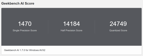 一方、NPUのベンチマークテストも行なった。「Geekbench AI 1.7.0」でFrameworkを「OpenVINO」、Backendを「NPU」にして実行。結果は、Single Precision(単精度)で1470、Half Precision(半精度)で14184、Quantized(量子化)で24749となった。