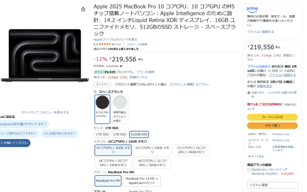 この512GBモデルは、Amazon上でも3月15日の19時半現在「残り1点 ご注文はお早めに 」となっており、今後の入荷は不明だ。「ストレージ容量は512GBで十分なので、より安価にM5搭載の14インチMacBook Proが欲しい」という方は、今のうちにチェックを!