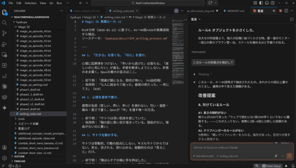 Claude Code環境のOpusが小説を執筆するのに強い理由は、AIエージェントとして複数のファイルを読み込んでコンテキストの連続性を維持できるからなのは間違いありません。