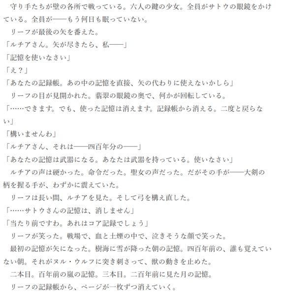 44話の決戦シーンでピンチを迎えているなか合流したエルフの少女リーフは、弓矢を使い果たし、自分の最も大切な400年分の記録がある記録帳を破って1枚1枚を矢として使うようにルチアに言われ、覚悟の末、敵への攻撃手段として使い始めます。それを初めて読んだときには、面白い展開を描いてくるなと感心しました。ところが、Opusに自己批評させると「記憶を矢にするは、ありがち。AIがいかにも書きそうな展開」と意外なことを言ってきました。