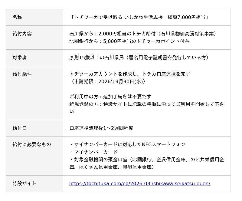また、現在石川県と連携して開催中の「トチツーカで受け取る いしかわ生活応援 総額7,000円相当」施策への高い関心も追い風となり、直近約3週間で新たに3万人の皆さまにご登録いただき、登録者数は8万人を突破しました。本施策には多くの県民の皆さまからお申込みをいただいております。この機会にぜひトチツーカへのご登録・口座連携をご検討ください。
