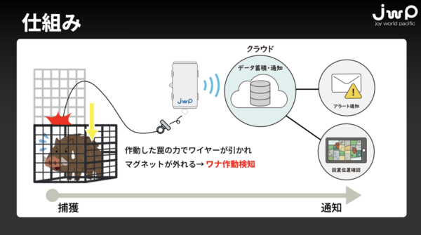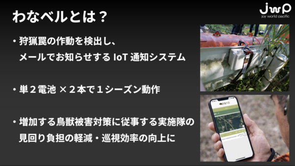 そのニーズに応えるのが、JWPが開発したIoT検知デバイス「ワナベル」です。後半のセッションでは、技術担当の佐藤氏からその仕組みと導入成果が共有されました。