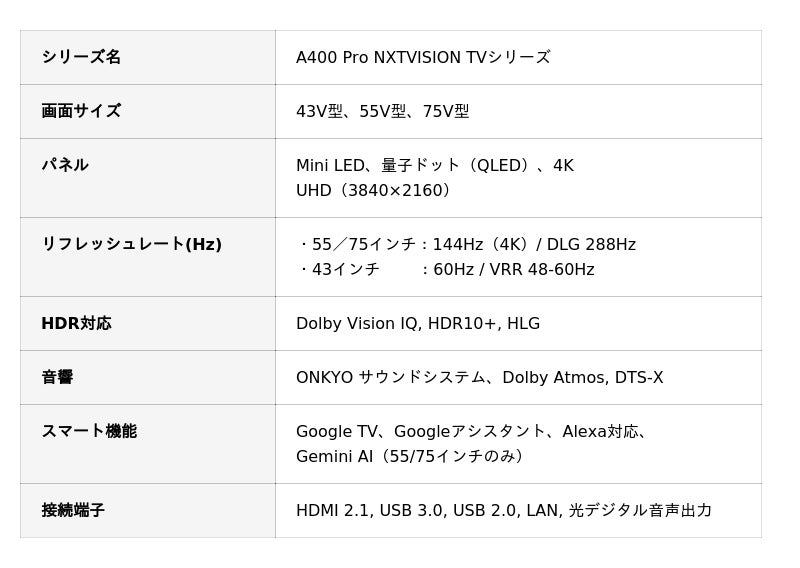 ・製品ホームページ:https://www.tcl.com/jp/ja/tvs/a400pro