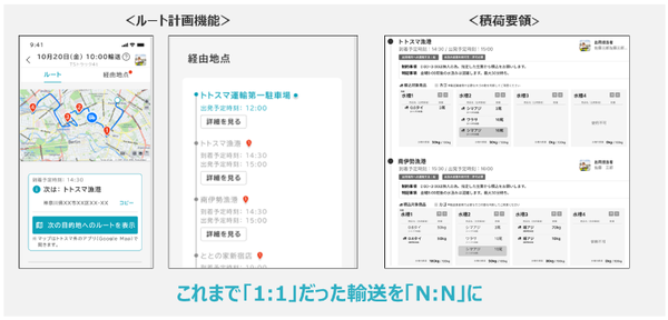 トトスマが目指すのは、この活魚輸送を「N対N」の物流に変えることだ。複数の出荷業者と複数の飲食店を組み合わせて輸送ルートを設計し、トラック1台に複数の荷物を混載することで、輸送コストを参加者全体で分担できるようにする仕組みを構築する。