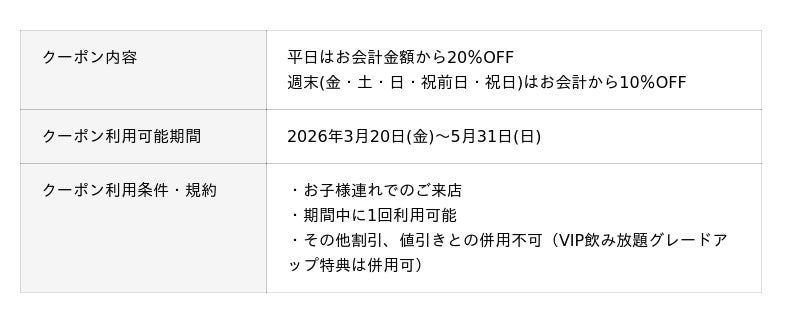 2026年3月20日(金)に、アプリ会員様にお子様連れで来店された時に利用できる期間限定クーポンを配信します。春休みにぜひご家族連れでご来店ください。
