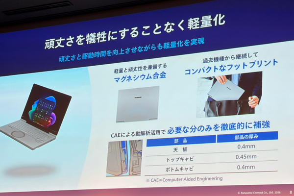 レッツノートの特徴の1つでもある頑丈設計については、76cmの高さからの26方向落下試験や、車載振動試験(MIL-STD-810H準拠)をクリア。液晶側面の強化や、シミュレーションによる筐体の最適化が施されている。
