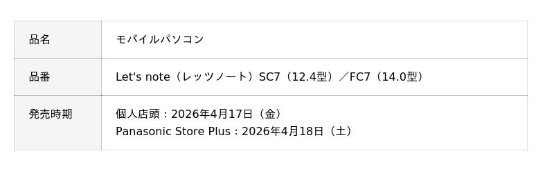 個人店頭・パナソニックストアプラス向けレッツノート「SC7」「FC7」が登場(2026年3月16日)