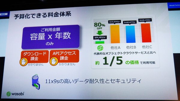 同社 営業部長の中村大介氏は、Wasabiのサービスはダウンロード課金もAPIアクセス課金もない“容量×年数のみ”の予算化しやすい料金体系をとっており、なおかつ主要オブジェクトストレージサービスの“およそ5分の1”の低価格を実現していると説明。現在の利用社数はグローバルで10万社を超えており、「日本でもご利用されるお客さまが増えている」と語る。