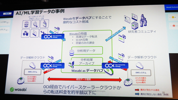WasabiがOCX XaaS Connectionに対応したことで、OCXのユーザー企業は閉域網経由で直接Wasabiストレージにアクセスできる。聴講するOCXパートナーに対し、中村氏は「Wasabiはあくまでも“薬味”だ。“メインディッシュ”のアプリケーションと組み合わせて、お客さまにご提供いただきたい」と述べ、ユースケースの一つとしてWasabiを「AI/データ分析のハブ」として活用する例を紹介した。