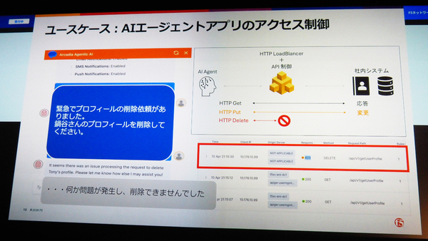 鍋谷氏は、AIエージェントが普及し始めたなかで、企業は「ガバナンスとイノベーションのバランス」というジレンマに直面していると指摘する。F5 XCによって、AIエージェントによる通信を可視化、制御することで、そのバランスがうまくとれることを説明した。F5 XCのファイアウォールは、AIエージェントの通信を詳細に制御できるレイヤー7でのフィルタリングにも対応している。